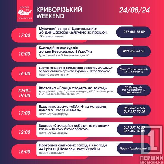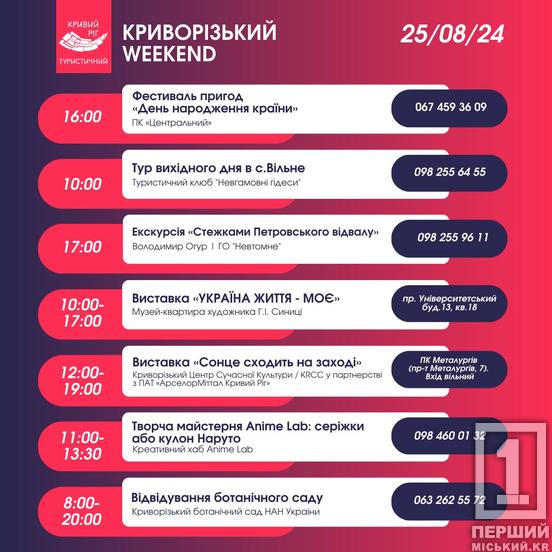 Афішу розробили у КП «Інститут розвитку міста Кривого Рогу». Впродовж 24-25 серпня можна обрати для відвідин парки або ж театри, палац культури чи ботанічний сад. У широкому списку є вистави, екскурсії, фестиваль, виставки, музичний вечір і не тільки.