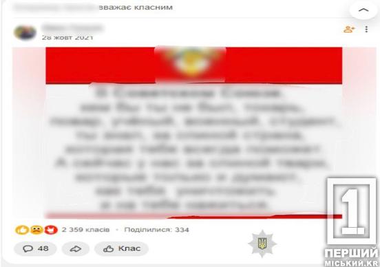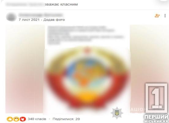 «Слідчі за погодженням з Криворізькою центральною окружною прокуратурою повідомили правопорушнику про підозру у скоєнні кримінального правопорушення, передбаченого ч. 1 ст. 436-1 (виготовлення, поширення комуністичної, нацистської символіки та пропаганда комуністичного та націонал-соціалістичного (нацистського) тоталітарних режимів) Кримінального кодексу України», - йдеться у повідомленні.