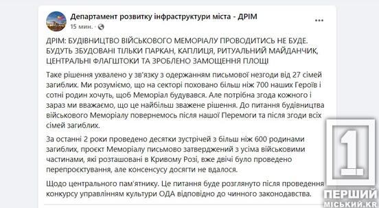 Будівництво військового меморіалу у Кривому Розі скасоване, - ДРІМ