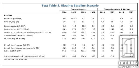 За базовим сценарієм МВФ прогнозує зростання ВВП України у 2024 році на рівні 3%, але очікує уповільнення економіки у другій половині року через енергетичний дефіцит. Інфляція досягне 9% до кінця року, а дефіцит поточного рахунку – 14,9 млрд доларів. Водночас, значне зовнішнє фінансування підтримає міжнародні резерви.