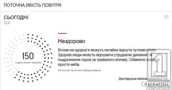 Станом на 13-ту годину 13 листопада Індекс якості повітря становить 150, а до цього фіксували 165 та навіть 169 – з позначками «Шкідливо» та «Дуже нездорово». За таких показників, негативний влив на самопочуття одразу відчувають чутливі люди.