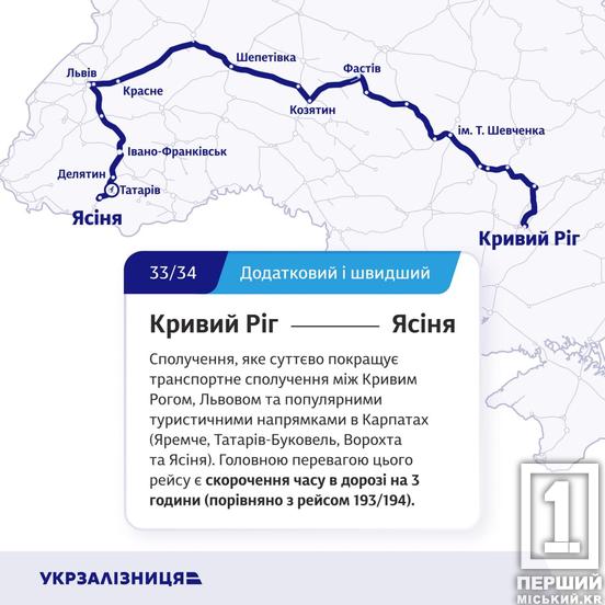 Нове додаткове сполучення здійснюватиме поїзд № 33/34 Кривий Ріг – Ясіня. Головною перевагою цього рейсу, в порівнянні з однойменним № 193/194, стане скорочення часу в дорозі на три години.