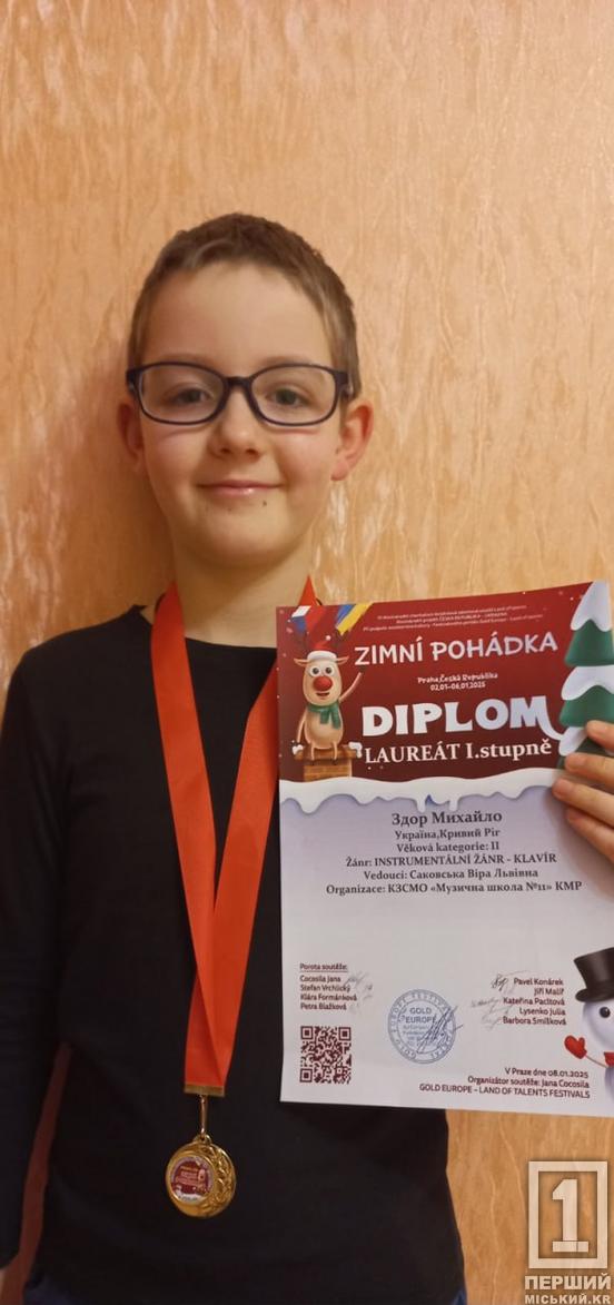 Аліна Ніголатій вразила журі своїми художніми роботами на конкурсі «Новорічні дива» у Києві. Вона посіла перше місце. Михайло Здор, юний піаніст, продемонстрував віртуозну гру на фортепіано, отримавши найвищі бали і ставши переможцем на конкурсах «Різдвяна казка» та «Зимова казка». Талановиті віолончелістки також вибороли призові місця на конкурсі «ZIMNI POHADKA» в Празі. Поліна Шкуропат та Анастасія Станкевич здобули першість, а Поліна Денисюк стала срібною призеркою.