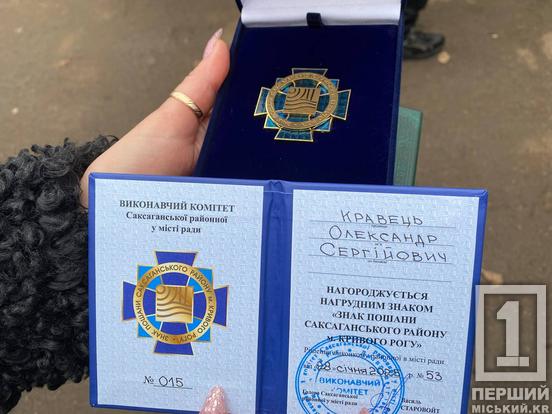Олександр був нагороджений нагрудними знаками «За заслуги перед містом» ІІІ ступеня та «Знак пошани Саксаганського району». Ці нагороди – свідчення його відваги та самовідданості.