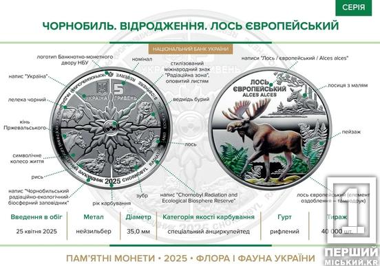 Національний банк вводить в обіг пам’ятну монету «Чорнобиль. Відродження. Лось європейський». Вона – присвята найбільшому представнику родини оленевих в Україні, який став символом відновлення природних екосистем Чорнобильського радіаційно-екологічного біосферного заповідника. Номінал 5 грн.