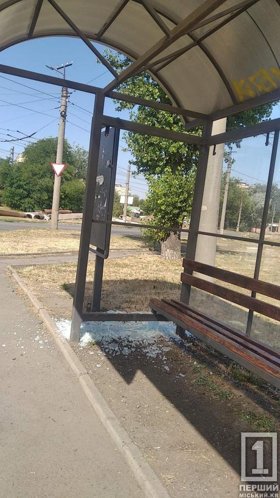 Вандали розбили бокове скло зупиночного павільйону. Криворіжців, які стають свідками подібних речей, закликають не мовчати. Потрібно телефонувати на 102. Псування майна міста не припустиме і тягне за собою відповідальність.