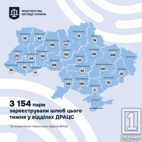 На Дніпропетровщині уклали 247 шлюбів. Цей показник помістив нас на друге місце після Києва. У столиці – 750. На Львівщині, Харківщині, Одещині було 212, 206, 158 відповідно. Загальна картина по країні відображена на інфографіці нижче.