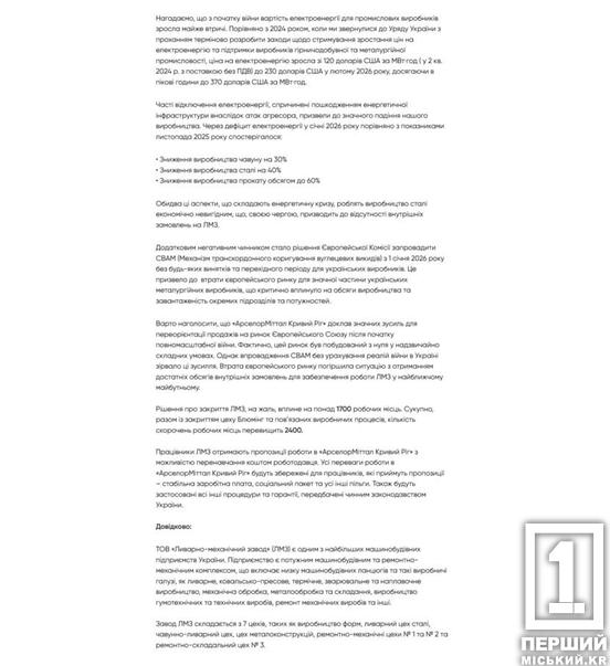 ПАТ «АрселорМіттал Кривий Ріг» оголосило про вимушене припинення роботи своєї дочірньої компанії — Ливарно-механічного заводу (ЛМЗ). Рішення набирає чинності через три місяці з дати оголошення.