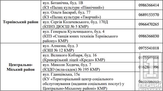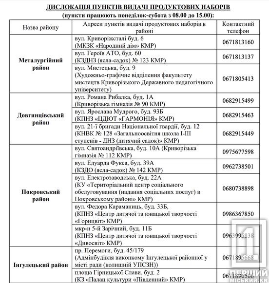 З питань роботи пунктів видачі продуктових наборів, доставки продуктових наборів за місцем перебування мешканці можуть звернутися безпосередньо до пунктів видачі продуктових наборів за наданими вище контактними телефонами, або Контакт-центру м. Кривого Рогу за номером 1520 (для операторів Київстар) та 499-1520 (для інших операторів) або на сайт https://spilkuisia.kr.gov.ua/