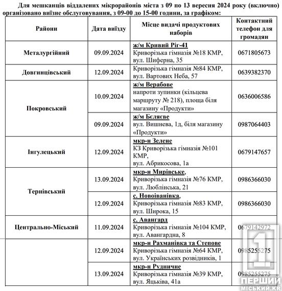 Для мешканців віддалених мікрорайонів міста з 09 по 13 вересня 2024 року (включно) організовано виїзне обслуговування, з 09-00 до 15-00 години, за графіком: