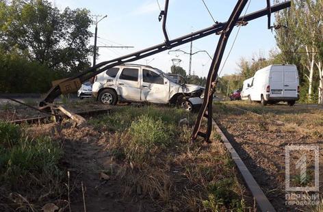 На участке дороги по улице Чумацкий шлях произошла авария. Водитель Renault Duster ехал со стороны ЮГОКа. По словам шофёра, во время движение у автомобиля лопнуло правое колесо. Машину выбросило на трамвайные пути. Она снесла металлическую электроопору и остановилась поперёк рельсов.