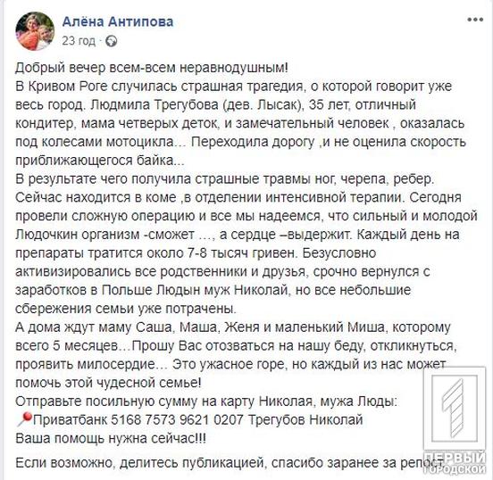 Женщине, которая попала под мотоцикл в Кривом Роге, сделали операцию, а сейчас просят помощи для дальнейшего лечения