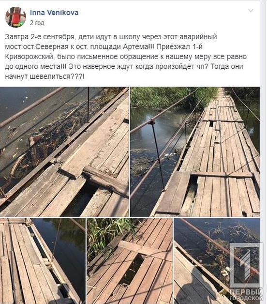 В соцсети криворожанка Инна Веникова опубликовала фото моста, на котором чётко видны дыры. Она рассказывает, это переправа через реку Саксагань от остановки «шахта Северная» к кольцу Владимира Великого. Женщина волнуется, так как именно через него дети ходят в школу.