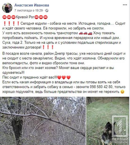 Анастасия предполагает, что пёс ждёт своих хозяев, так как не отходит от одного места. Она просит отозваться бывших владельцев собаки, если вдруг они захотят забрать её. Либо тех, кто готов приютить на время или постоянно найдёныша. Женщина оставила свой контактный номер (098) 580-42-80.