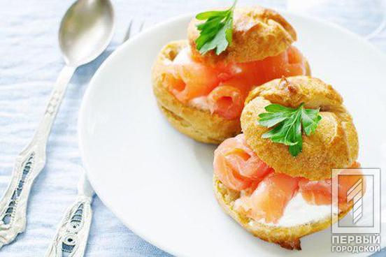 В творог нужно добавить сливки, измельченный укроп, соль с перцем по вкусу и взбить до однородной массы. Далее в приготовленных или купленных профитролях (тарталетках) необходимо срезать верхушки и наполнить их приготовленной взбитой массой. Следующий этап – нарезать тоненькими слайсами лосось и свернуть в симпатичную форму. Закуска украшается красной рыбой, икрой и зеленью.