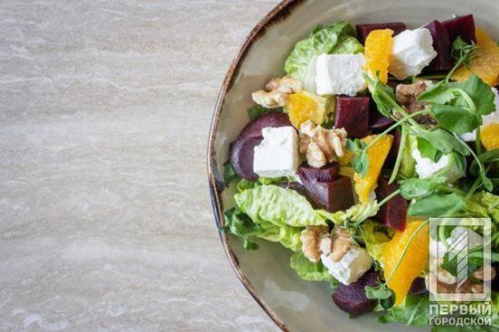 Апельсин очистить и нарезать на сегменты без кожицы и убрать косточки. Отварную свеклу остудить, очистить и нарезать дольками или кубиками. На блюдо выложить салат, нарезанные свеклу и апельсины. Распределить сверху сыр. Приготовить заправку: смешать мёд, горчицу, масло оливковое и бальзамический соус, выжать сок из остатков апельсина, перемешать. Полить заправкой салат, посыпать молотым чёрным перцем. Украсить грецкими орехами.