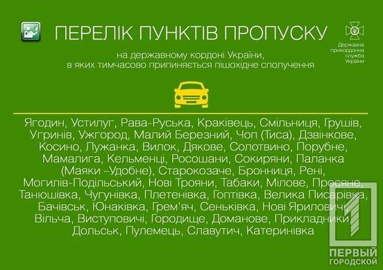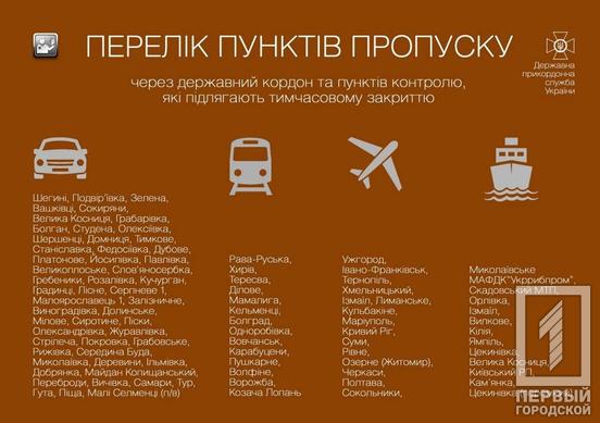 Для борьбы с распространением нового недуга на территории Украины временно закроют часть пропускных пунктов на границе с соседними государствами. В первую очередь это ограничение коснётся пунктов с низким пассажирским трафиком. При этом будет сохранён достаточный поток между Украиной и соседними государствами. Всего под временное закрытие попадут 107 из 230 существующих пунктов – автомобильные, пешеходные, железнодорожные, речные и авиационные. Подробный список КПП разместили на сайте Кабинета Министров Украины.