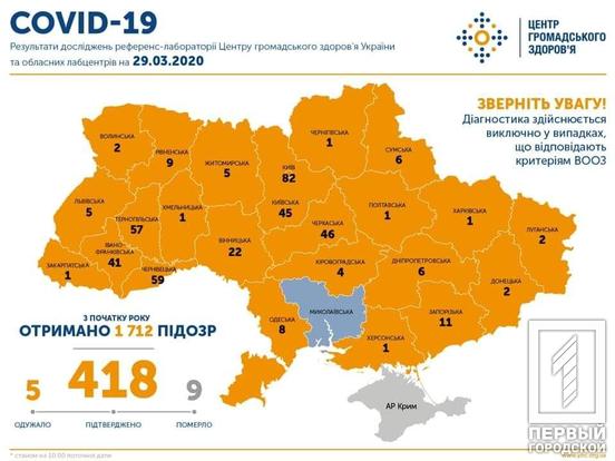 Всего в нашей стране сейчас подтверждено 418 случаев, 109 – за последние сутки. Также по данным МОЗ после верификации результатов по одному случаю перенесли из Николаевской и Днепропетровской областей в Киевскую. Таким образом в Днепропетровской сейчас подтверждённых шесть, а в Николаевской – ни одного заболевшего.