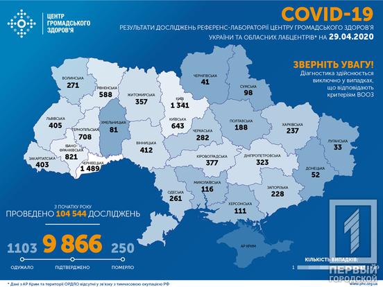 По состоянию на 9:00 29 апреля в Украине обнаружили 9866 случаев заражения коронавирусом, из них 250 человек погибли, 1103 выздоровели. За минувшие сутки COVID-19 обнаружили у 456 человек.