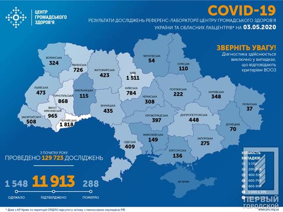 По состоянию на 9:00 3 мая в Украине зарегистрировали 11913 случаев заражения коронавирусом, из них 288 человек погибли, 1547 выздоровели. За минувшие сутки COVID-19 диагностировали у 502 человека.