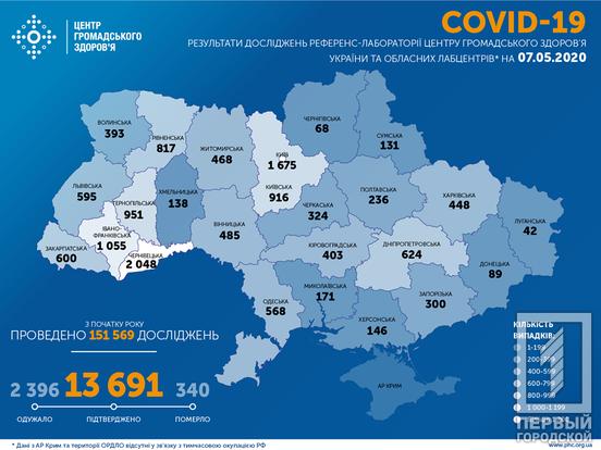По состоянию на 9:00 7 мая в Украине зарегистрировали 13691 случай заражения коронавирусом, из них 340 человек погибли, 2396 выздоровели. За минувшие сутки COVID-19 диагностировали у 507 человек.