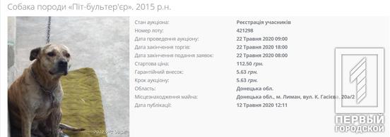 На сайте Системы электронных торгов арестованного имущества есть ещё один пёс – пит-бультерьер из Донецкой области за 112 грн 50 копеек.