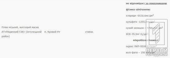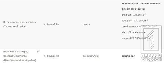 Оставшиеся места отдыха: пляжи на улице Маршака и жилмассиве ЮГОКа не соответствуют по физико-химическим нормам. Там превышено содержание хлоридов, сульфатов и сухого остатка. Также в воде зафиксировано превышение концентрации кишечной палочки.