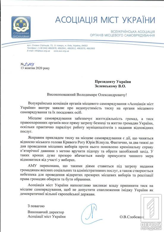 13 октября Ассоциация городов Украины обратилась с официальным письмом к Президенту Украины Владимиру Зеленскому и в Организацию по безопасности и сотрудничества в Европе. Поводом послужило недопустимое давление на органы местного самоуправления. В частности речь идёт о давлении на мэра Кривого Рога Юрия Вилкула. Информация об этом появилась на сайте Ассоциации городов Украины.