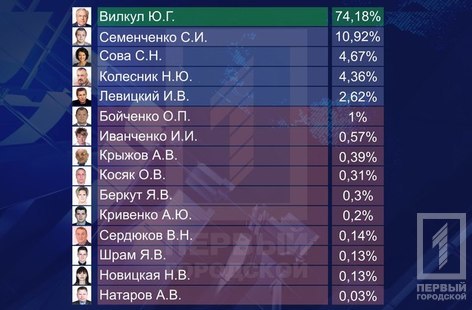 28 марта в 18:15 горизбирком Кривого Рога объявил результаты выборов мэра Кривого Рога. Согласно официальному протоколу, победителем стал Юрий Вилкул с результатом 74,18%.