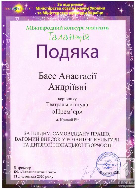 Студия «Премьер», при Криворожском академическом городском театре музыкально-пластических искусств «Академия движения», неоднократно побеждает в различных конкурсах. Недавно среди наград студии появились ещё две за хореографическую постановку That Man, хореографом которой является Анастасия Басс. Она также получила благодарность за плодотворный, самоотверженный труд, весомый вклад в развитие культуры и детского и юношеского творчества.