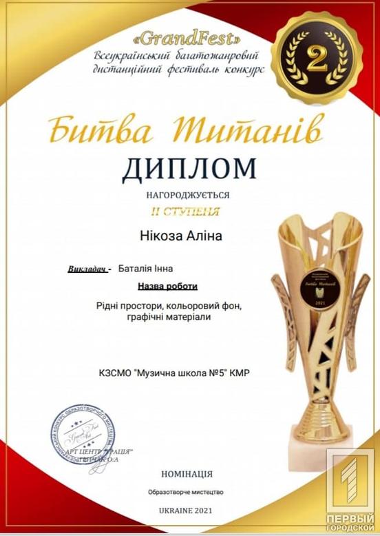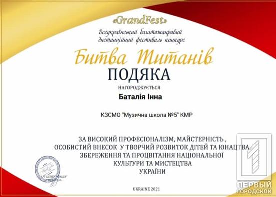 Дистанционный фестиваль-конкурс «Битва Титанов» базировался во Львове. Воспитанница криворожской музыкальной школы стала лауреатом второй степени. Об этом сообщили в исполкоме Саксаганского райсовета.