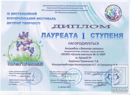 С 20 по 21 марта в Днепре проходил IX Дистанционный Всеукраинский фестиваль детского творчества «Первые подснежники». Кривой Рог на нём представил вокальный ансамбль воспитанников школы искусств №1 «Звонкая капель» под руководством Таисии Чумаченко и концертмейстеров Натальи Котельниковой и Андрея Грищенко. Коллектив стал лауреатом I премии конкурса.