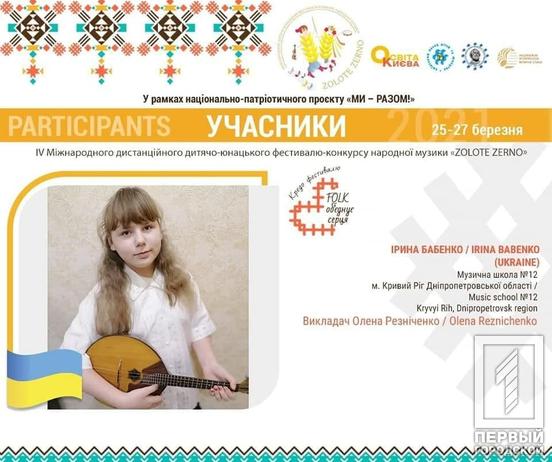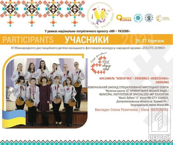 Воспитанники Криворожской музыкальной школы №12 заняли призовое место на конкурсе народной музыки ZOLOTE ZERNO». Ребята боролись за первое место с музыкантами из разных стран мира. Об этом сообщается на странице Управления культуры исполкома Криворожского горсовета в соцсети