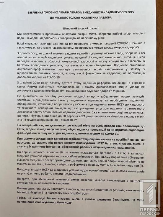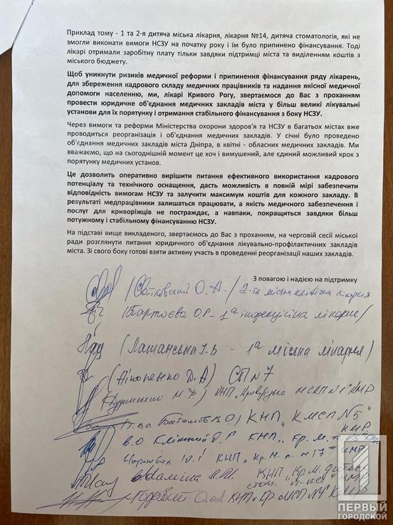 «Чтобы избежать рисков медреформы и прекращение финансирования ряда больниц, для сохранения кадрового состава медицинских работников и оказания качественной медицинской помощи населению, мы, врачи Кривого Рога, обращаемся к Вам с просьбой провести юридическое объединение медицинских учреждений города для их спасения и получения стабильного финансирования со стороны НСЗУ.