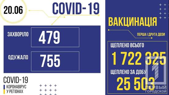 По состоянию на 8:00 20 июня в Украине зарегистрировали 2 229 523 случая заражения коронавирусом, 52 016 человек умерли, 2 151 463 выздоровели. За минувшие сутки COVID-19 обнаружили у 479 человек, в том числе у 15 детей и у шести медиков, 24 пациента скончались, 755 вылечились.