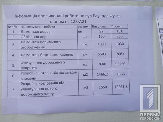 На данный момент работники коммунальных служб уже выполнили фрезерования дорожного покрытия на участке 7 680 квадратных метров, разработали котлованы для заезжих карманов объёмом 1 466 квадратных метров, спилили 92 дерева из 131 запланированных, а обрезали 160. Работы по демонтажу охватили 5 583 метра бортового камня, а перильного ограждения - общей площадью около тысячи метров.