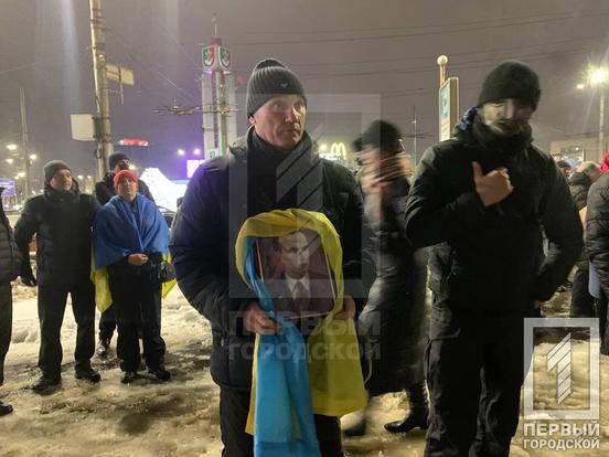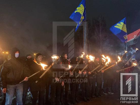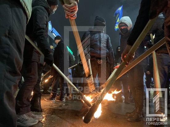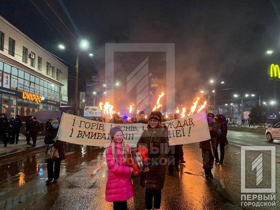 Участники марша зажгли факелы и в 17:00 двинулись от народной стелы героев, проезжей частью в сторону исполкома к памятнику основателю Кривого Рога.