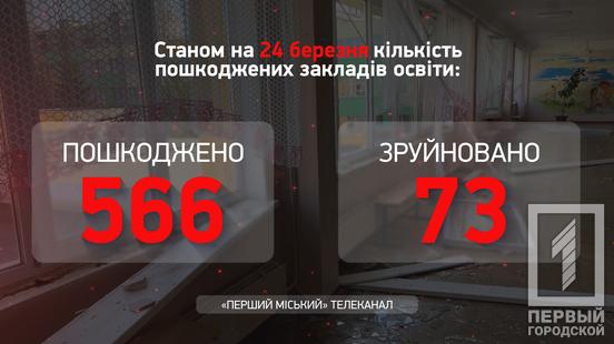 В результате бомбардировок и обстрелов повреждено 566 учебных заведений, 73 из которых разрушены полностью. Среди учебных заведений получили повреждения и разрушения более 230 школ и 155 детских садов. Больше всего повреждено в Донецкой, Харьковской, Николаевской, Сумской, Киевской, Херсонской, Черниговской областях и в Киеве. Кроме того, разрушены более 40 заведений для детей, среди которых лечебные, школы искусств, спортивные объекты, библиотеки.