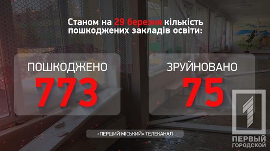 Кроме того, войска россии постоянно попадают в образовательные заведения, из-за этого в Украине повреждено уже 773 учебных заведения, 75 из них разрушены полностью. Больше всего обстреливают и бомбардируют образовательные учреждения в Донецкой, Харьковской областях, Киеве, Николаевской, Житомирской, Сумской, Киевской и Херсонской областях.
