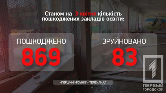 Кроме того, оккупанты продолжают попадать ракетами в учебные заведения. В частности, с начала войны с рашистами повреждено 869 учебных заведений, из которых 83 разрушены до основания.