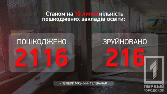 Кроме того, российские военные постоянно обстреливают и бомбардируют украинские объекты гражданской инфраструктуры, в результате чего разрушаются жилые дома, больницы, детские сады, торговые центры, драматические театры и т.д. С начала полномасштабного вторжения рашистов в нашей стране повреждено 2 116 учебных заведений, из которых 216 разрушены.