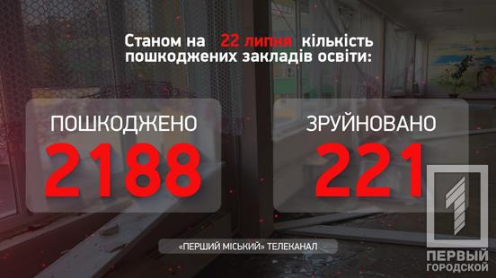Кроме того, российская армия уничтожает учебные заведения Украины. Известно, что в результате обстрела повреждено 2 188 образовательных учреждений, из которых 221 разрушены полностью.