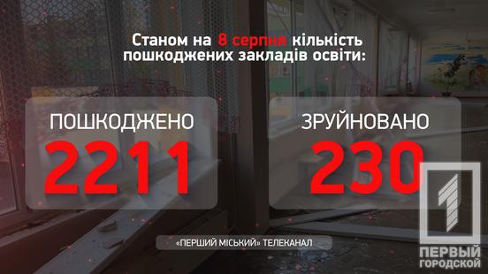 Между тем, военные россии постоянно атакуют наши города и поселки, в результате чего разрушается инфраструктура, это касается и учебных заведений. Через неделю враги повредили еще 12 учебных заведений, из которых пять разрушены до основания. Общее количество попавших под обстрелы учреждений составляет 2 211, а не подлежат восстановлению из них 230.