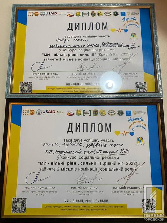 Кроме того, не остались равнодушными к творчеству молодежи и ввели дополнительный призовой фонд Криворожский местный центр по предоставлению БВПП, Школа безопасности, Институт развития города Кривого Рога, Ингулецкий районный суд города Кривого Рога Днепропетровской области, Криворожское городское правозащитное общество и Патрульная полиция Кривого Рога. Ведь все представленные работы - такие яркие и содержательные, а авторы и авторы такие талантливые.
