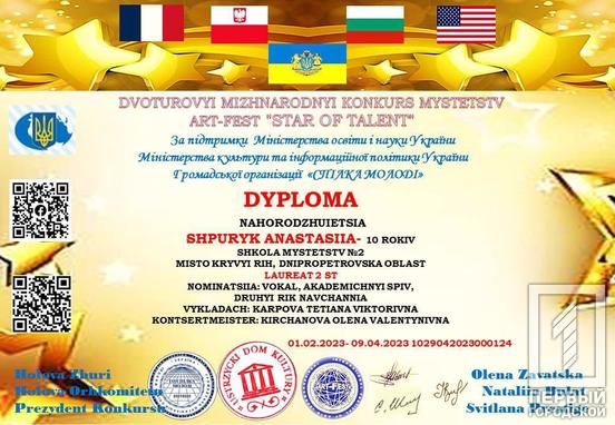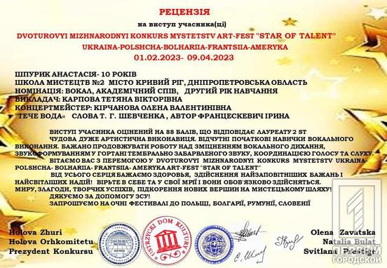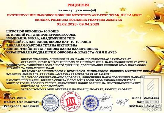 Также Вероника Шерстюк и Анастасия Шпурик поразили своим талантом и признаны на Международном фестивале-конкурсе искусств «Star of talent». Обе получили второе место. Преподаватель Татьяна Викторовна Карпова и концертмейстер Елена Валентиновна Кирчанова помогли девушкам раскрыть свой потенциал и проявить творческие способности.