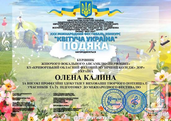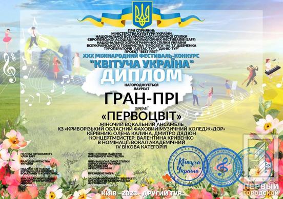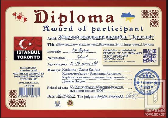 Женский вокальный ансамбль «Первоцвет» из Криворожского областного профессионального музыкального колледжа своим нежным благозвучным пением покоряет не только всеукраинские, но и мировые высоты. Недавно коллектив стал победителем сразу двух международных конкурсов: канадско-украинского Istanbul-Toronto и «Цветущая Украина». Об успехе своих вокалисток сообщают представители музыкального колледжа на своих страницах в соцсети.