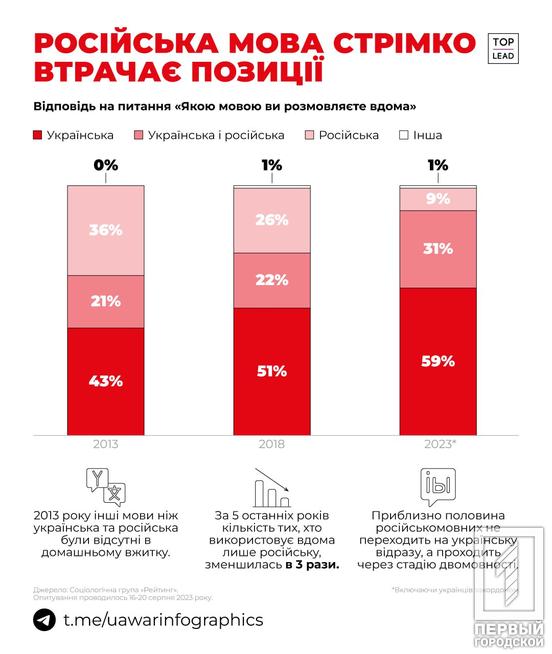 За 2018-й доля украиноязычных составила 51%. Микс двух языков наблюдался в 22% ситуаций. Российский в этот год занимал 26%. После полномасштабного вторжения на текущий момент языковая картина выглядит следующим образом: