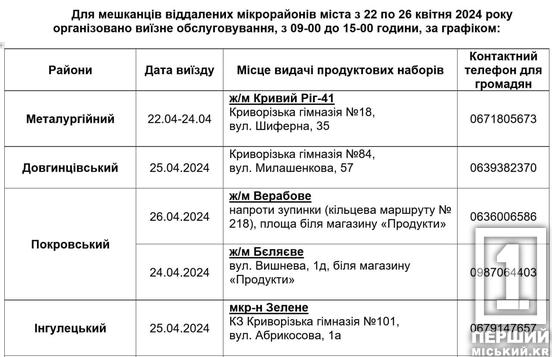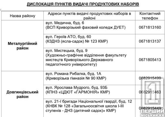 По вопросам работы пунктов выдачи продуктовых наборов, доставки продуктовых наборов по месту пребывания жители могут обратиться непосредственно в пункты выдачи продуктовых наборов по предоставленным выше контактным телефонам, районных управлений труда и социальной защиты населения или Контакт-центра г. Кривого Рога по номеру 1520 (для операторов Киевстар) и 499-1520 (для других операторов) или на сайт.