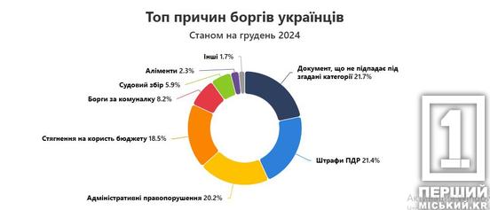 Наибольшую долю в общем количестве долгов составляют штрафы за нарушение правил дорожного движения - более 1,8 миллиона, или 21% от общего количества. На втором месте - административные штрафы: 1,7 миллиона записей (20%). Взыскания в пользу государственного бюджета составляют 1,6 миллиона (18,5%). Замыкают первую четверку долги за коммунальные услуги - 727 тысяч (8%).