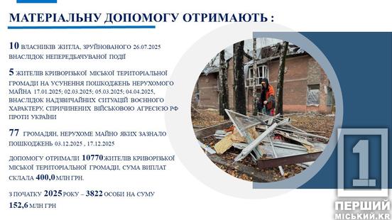 В этом месяце город окажет помощь семьям, жилье которых повреждено или разрушено: 10 владельцам (9 квартир) жилья, разрушенного 26 июля 2025 года в результате непредвиденного события (пожар в доме 10 по ул. Вали Котика). Также материальную помощь получат 5 жителей на устранение повреждений недвижимого имущества 17.01.2025; 02.03.2025; 05.03.2025; 04.04.2025, в результате чрезвычайных ситуаций военного характера, вызванных военной агрессией России против Украины, 77 граждан, недвижимое имущество которых было повреждено 03.12.2025, 17.12.2025 (общая сумма выплат 1,7 млн грн.). В целом на устранение повреждений или разрушения жилья, утрату родных в течение 2022-2025 годов помощь получили уже 10770 жителей, общая сумма выплат составила 400 млн грн. С начала 2025 года – 3822 человека на сумму 152,6 млн грн.